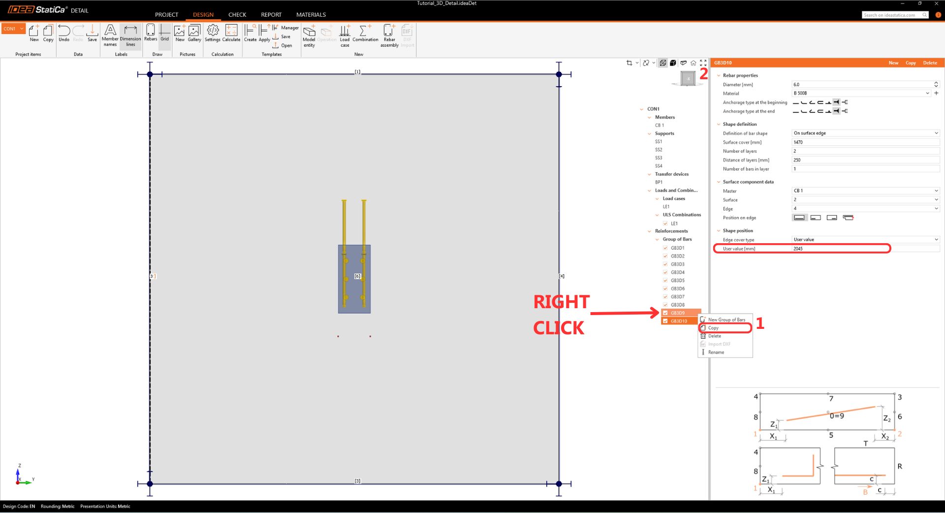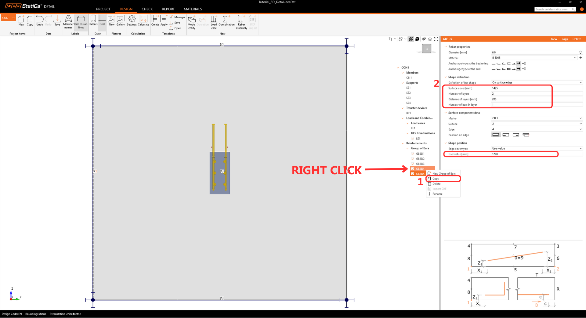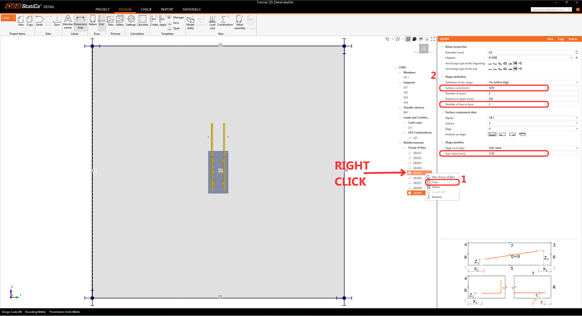 Add another item by selecting Rebar-Assembly > Group of bars 3D again, and modify the Properties.