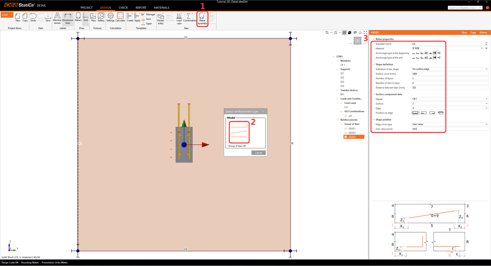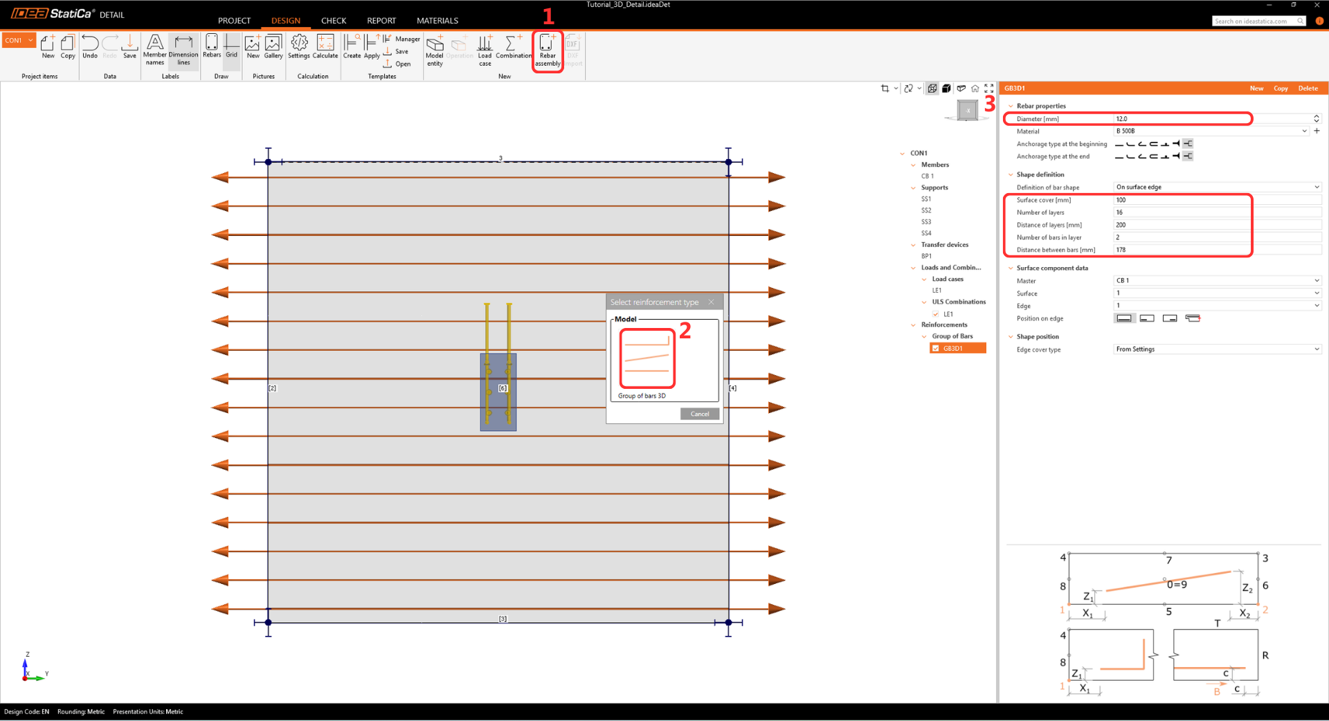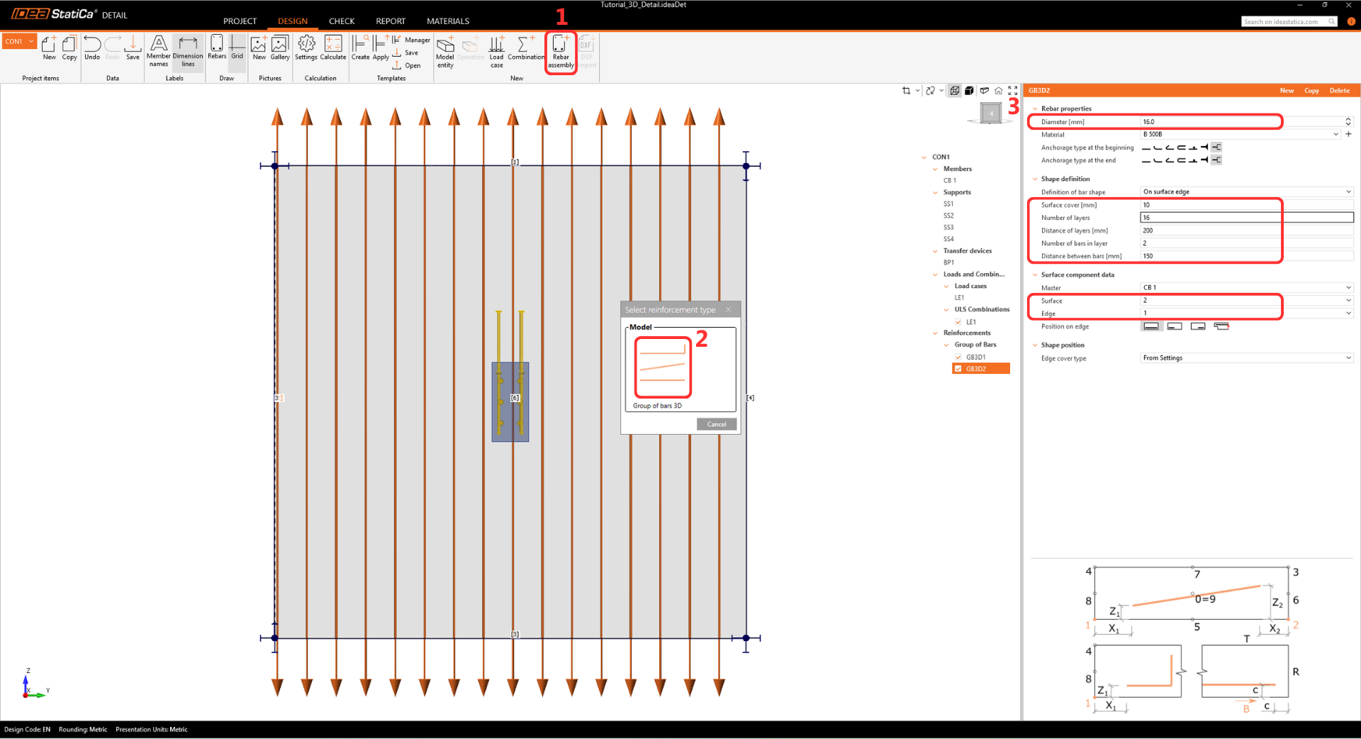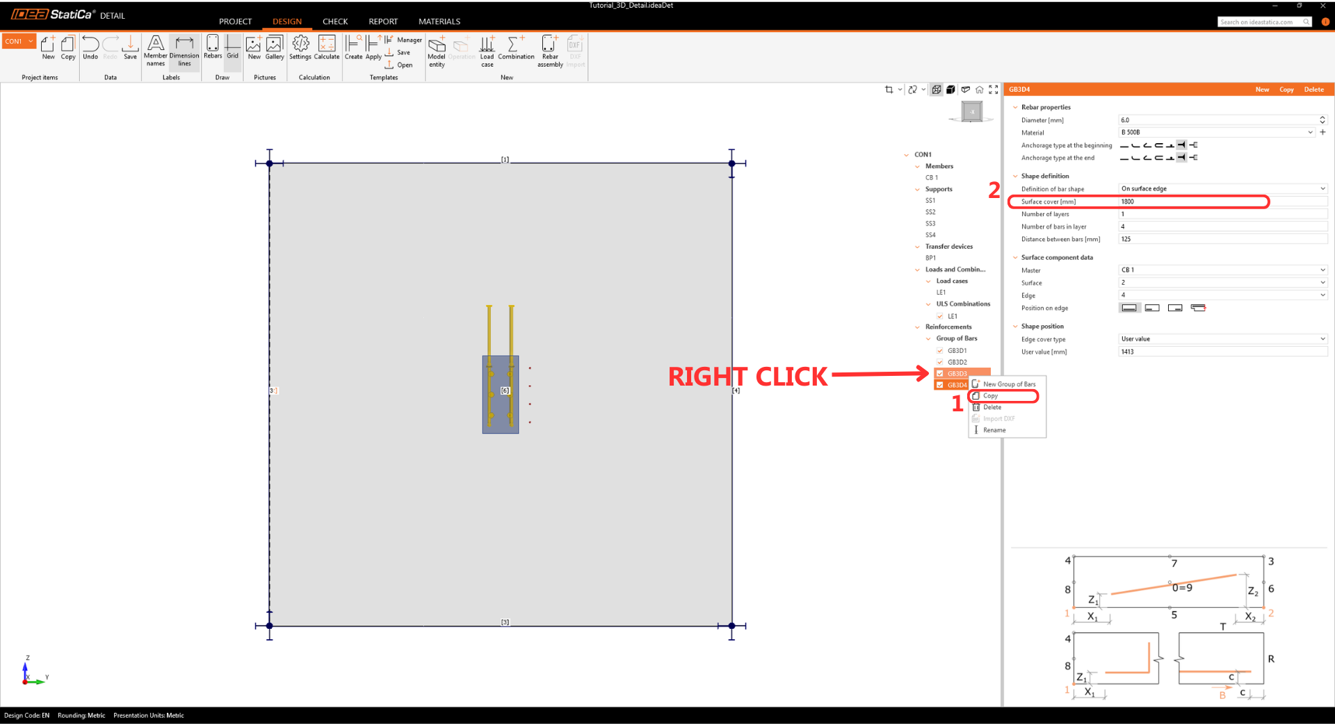 Add another item by selecting Rebar-Assembly > Group of bars 3D again, and modify the Properties.