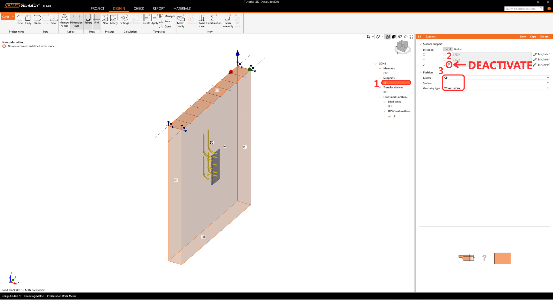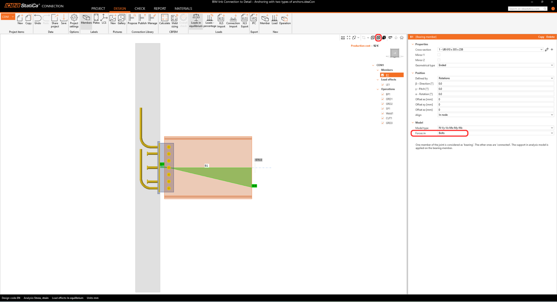 You have performed a complete design check according to EN 1993-1-8 (steel joints), EN 1992-4 (anchors), and EN 1992-1-1 (concrete structures). The steel joint and anchorage were verified in IDEA StatiCa Connection, while the concrete block integrity and reinforcement were analyzed in IDEA StatiCa Detail using the CSFM method compliant with EN 1992-1-1.