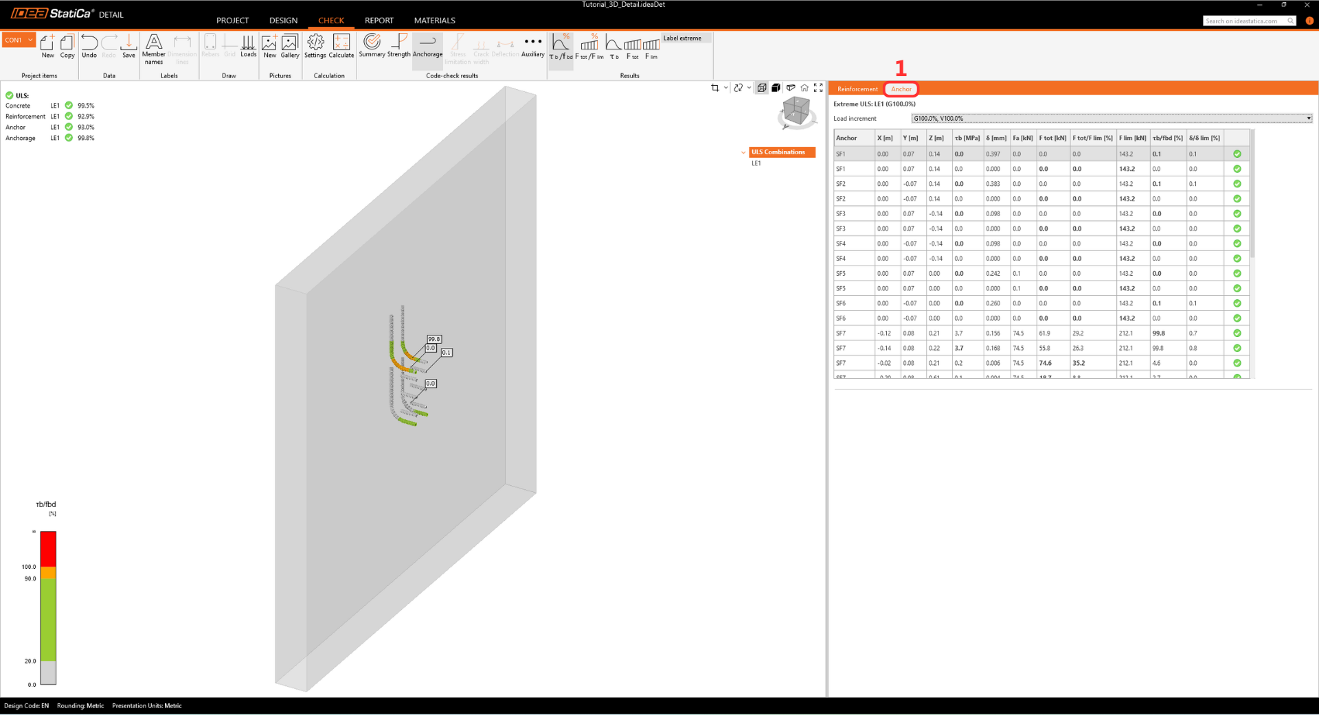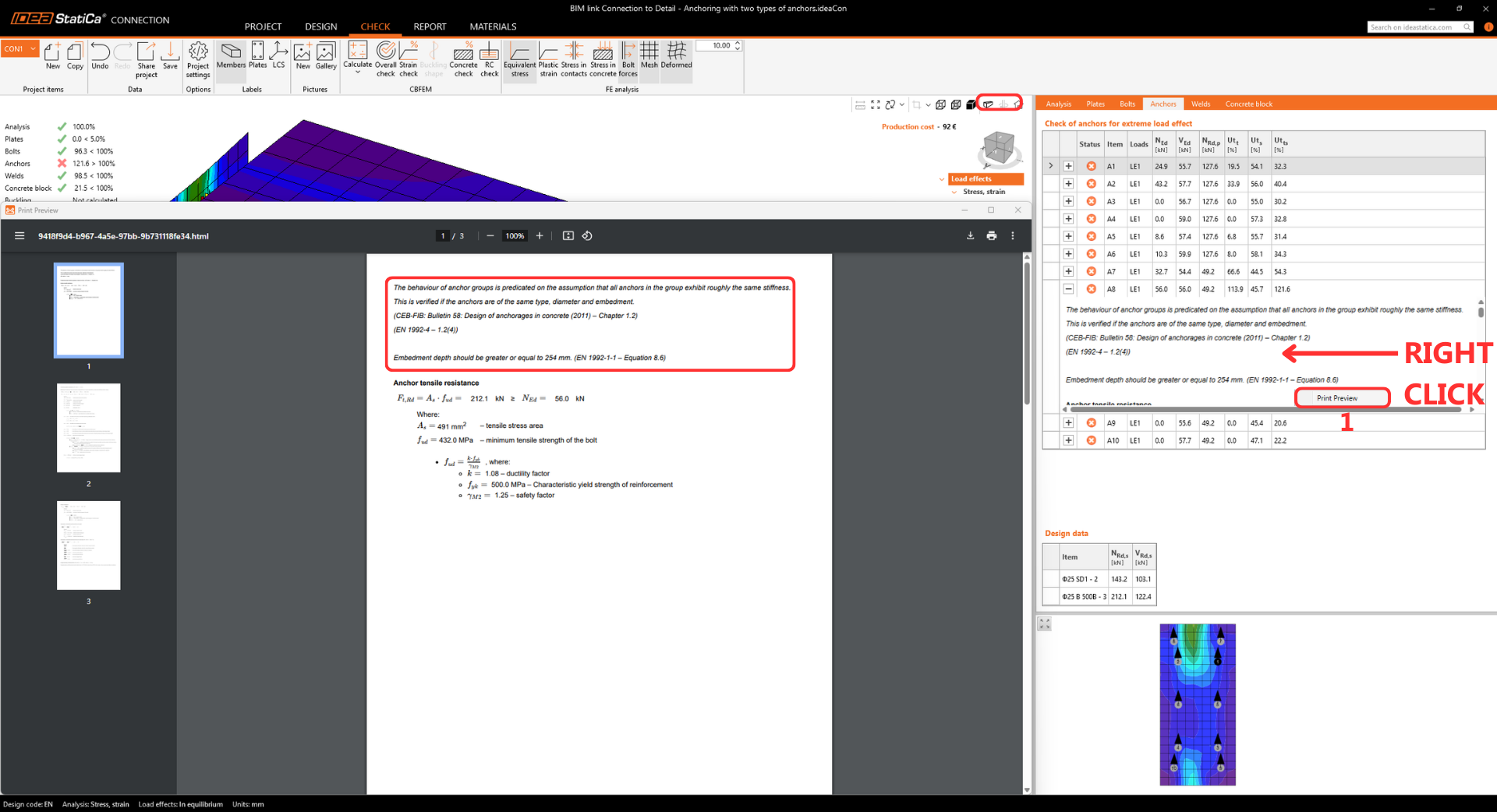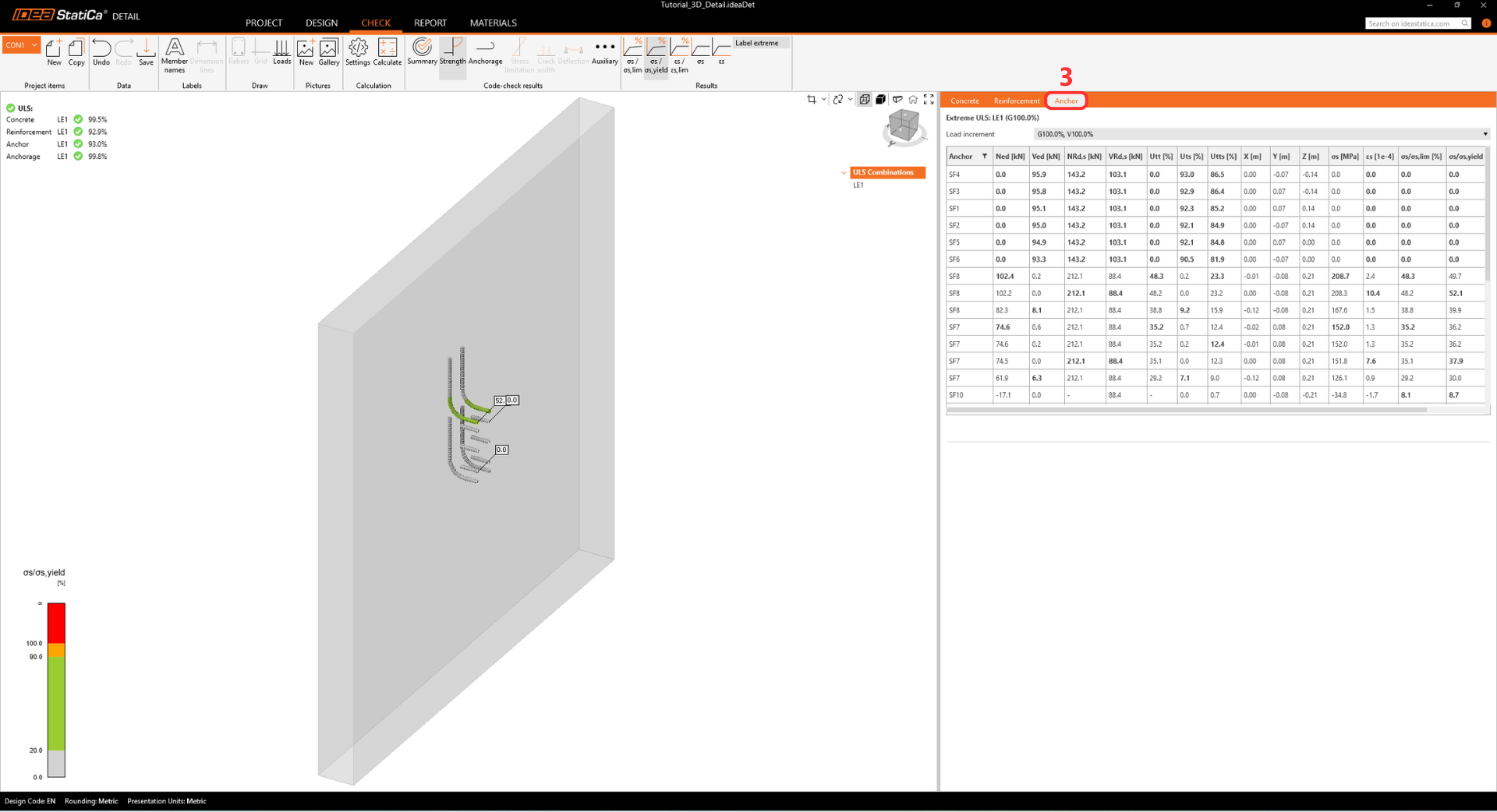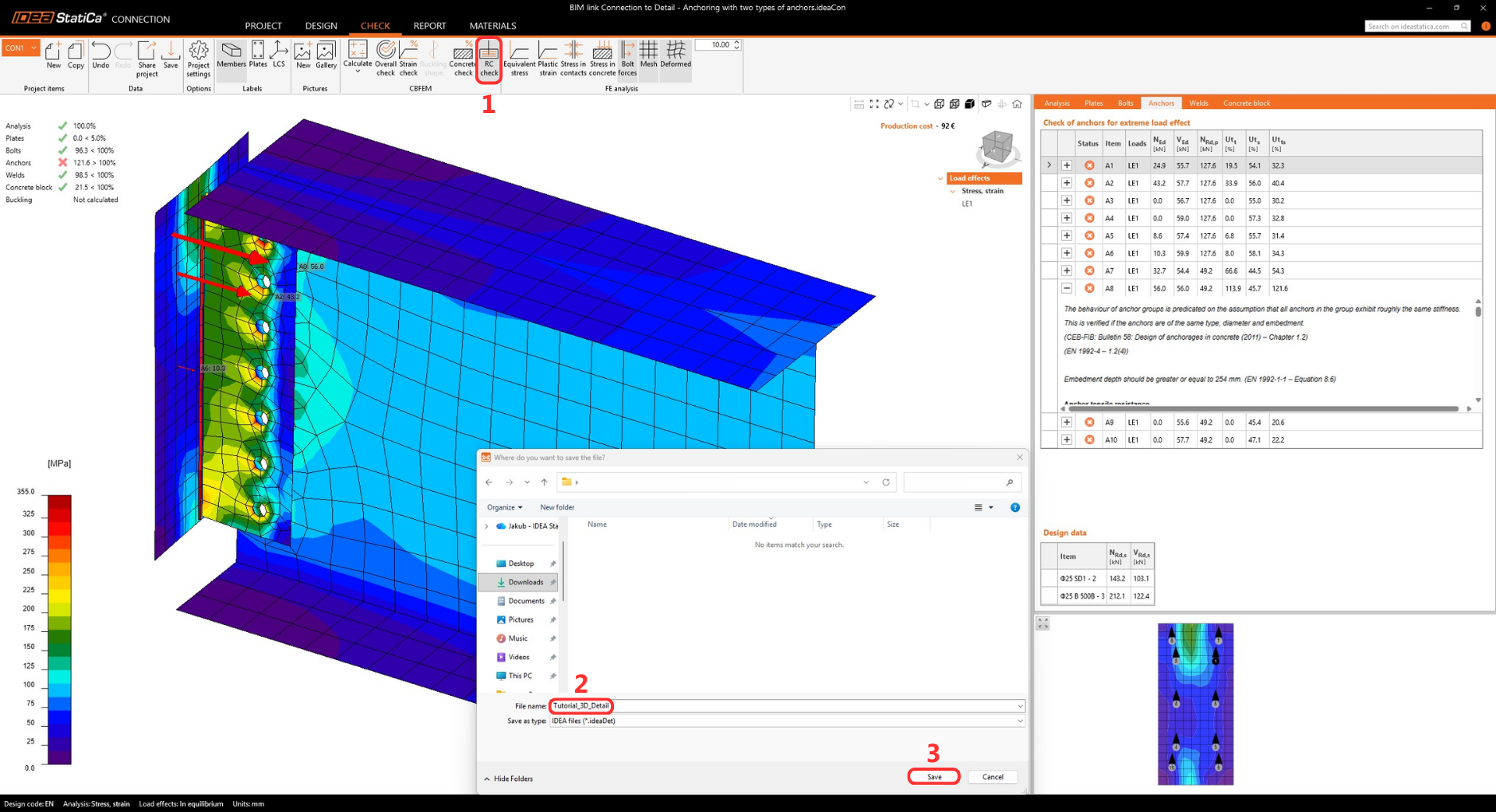 • The warning regarding insufficient embedment depth appears because this tutorial represents a real-world example with a thin wall and shallow anchors. The design's structural integrity is proven further in the Detail app.