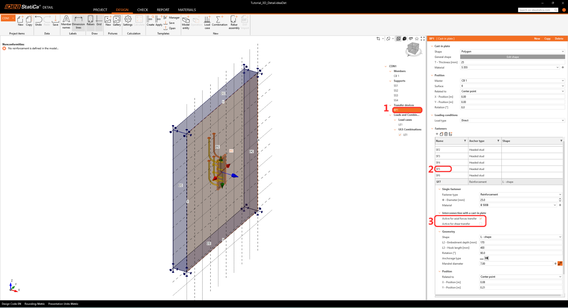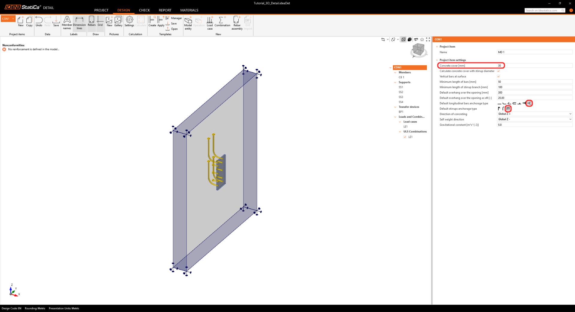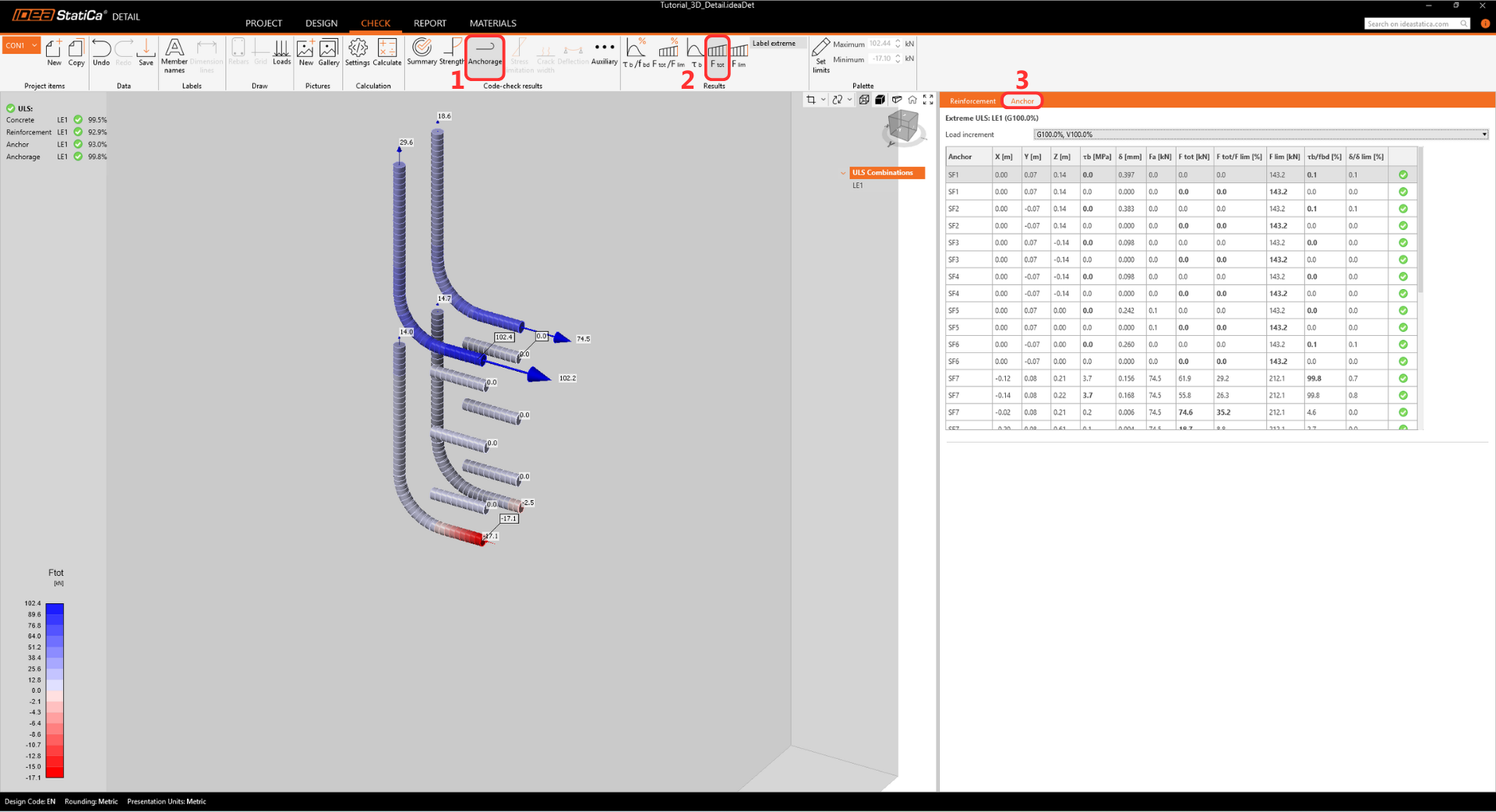 • The warning regarding insufficient embedment depth appears because this tutorial represents a real-world example with a thin wall and shallow anchors. The design's structural integrity is proven further in the Detail app.