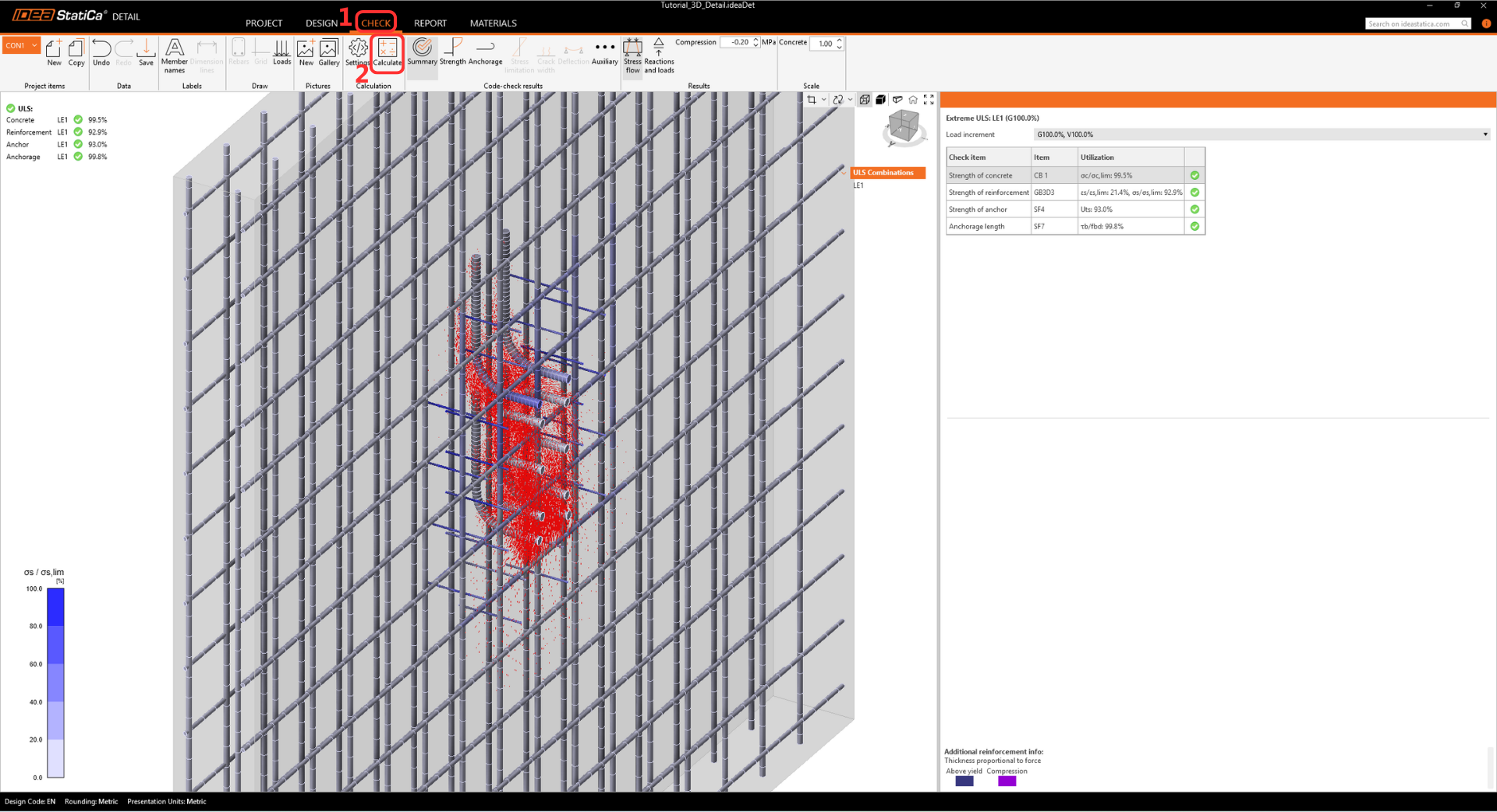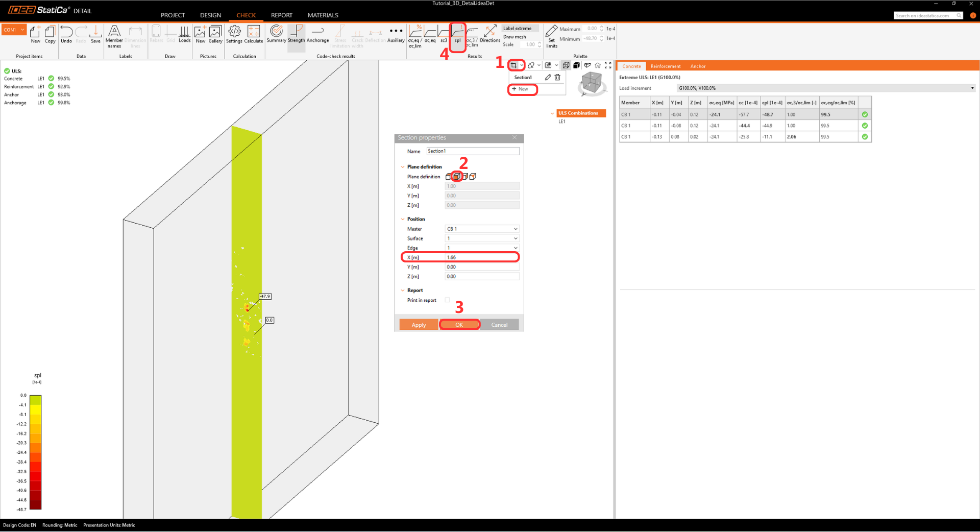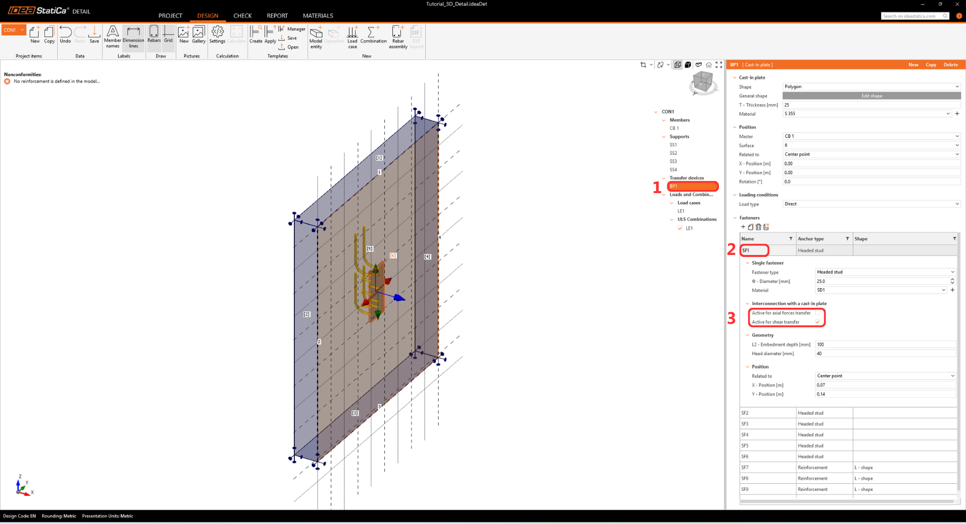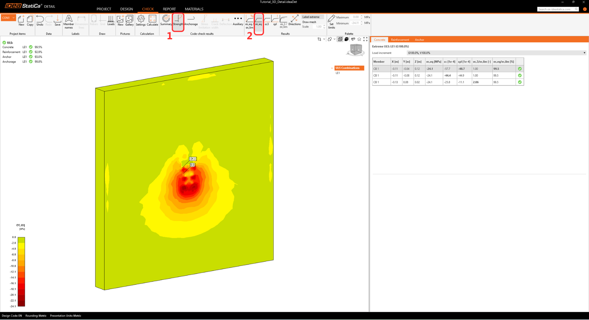 • The warning regarding insufficient embedment depth appears because this tutorial represents a real-world example with a thin wall and shallow anchors. The design's structural integrity is proven further in the Detail app.