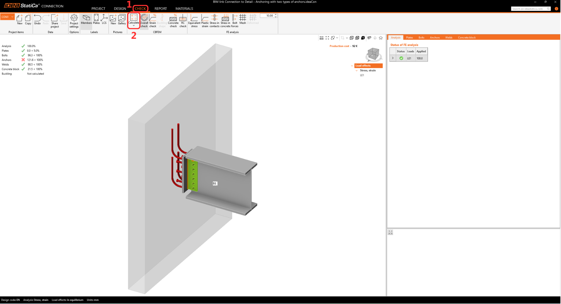 Switch to card, Check -> Calculate. The code check proves the failure mode on the anchors. By default, the concrete block is assumed to be cracked.