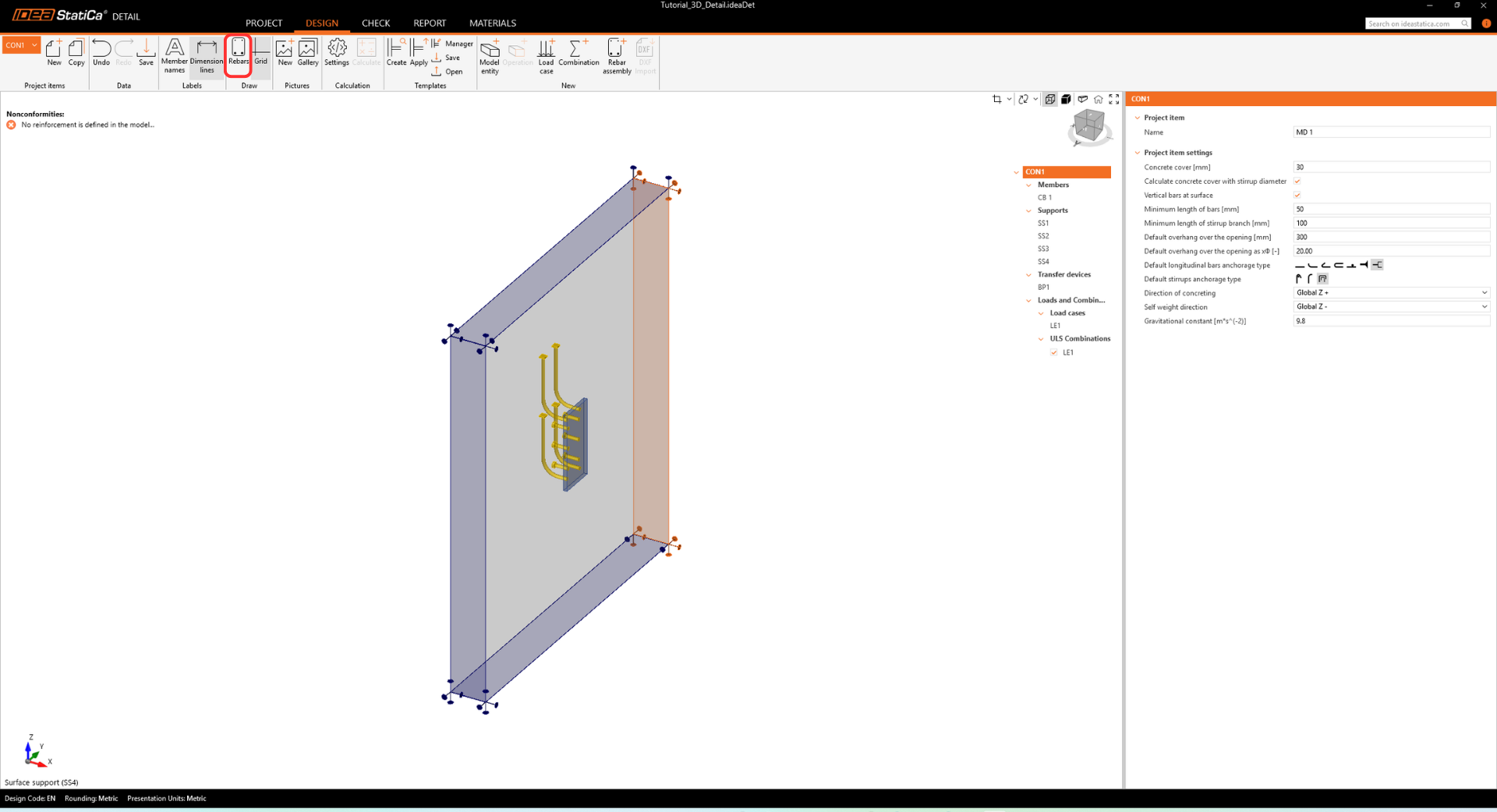 Before defining the reinforcement, deactivate the Rebars button. This ensures that only the specific bar group you are currently selecting is visible, keeping the view clean and uncluttered.