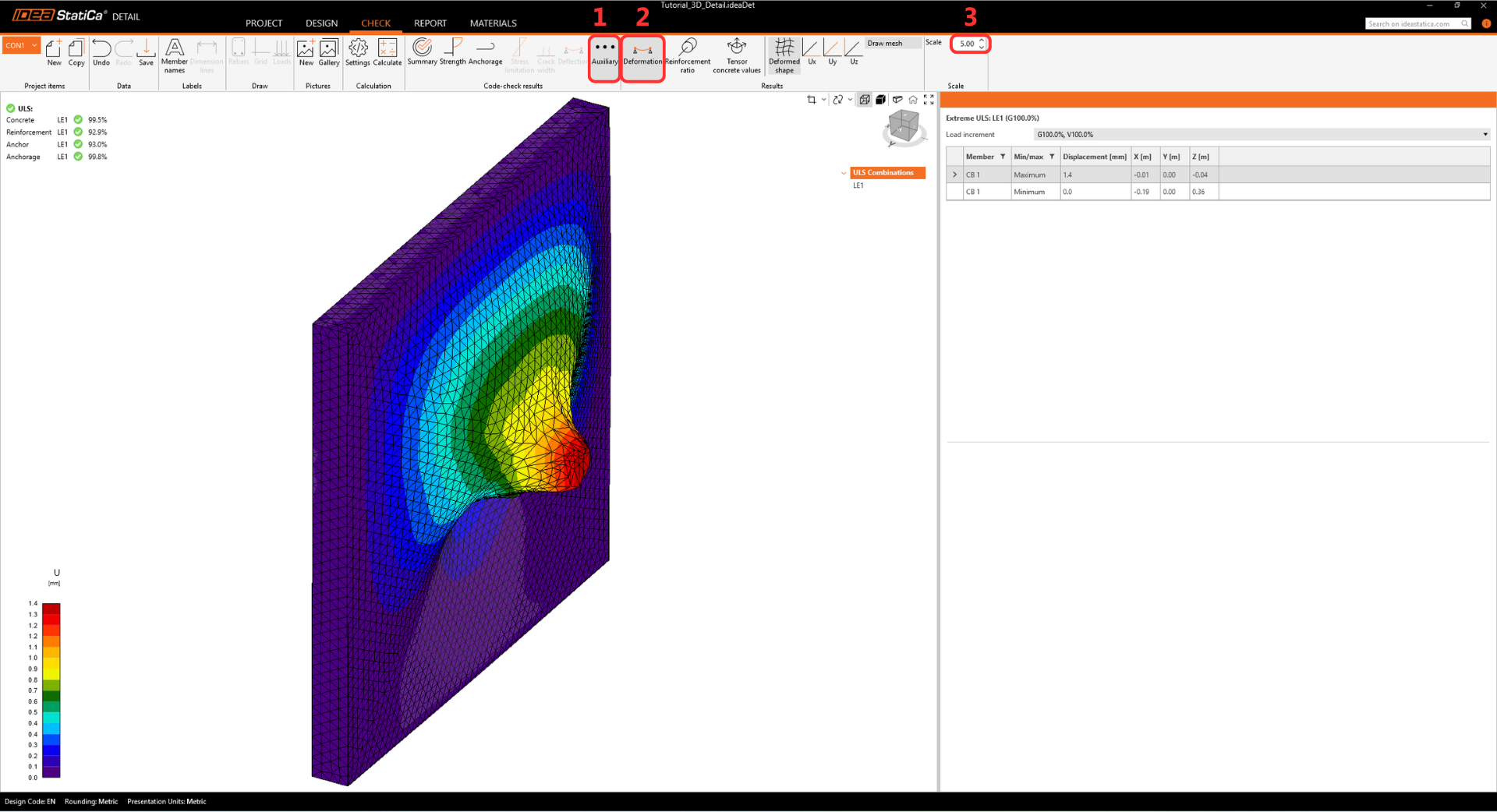 Switch to the Auxiliary tab and turn on Deformation. Although deformation limits are not prescribed for ULS (Ultimate Limit State), reviewing the deformed shape is a crucial sanity check. It ensures that the model is stable and not experiencing unrealistic displacements or rotations (e.g., due to disconnected elements). This visual inspection helps quickly identify any potential modeling issues.