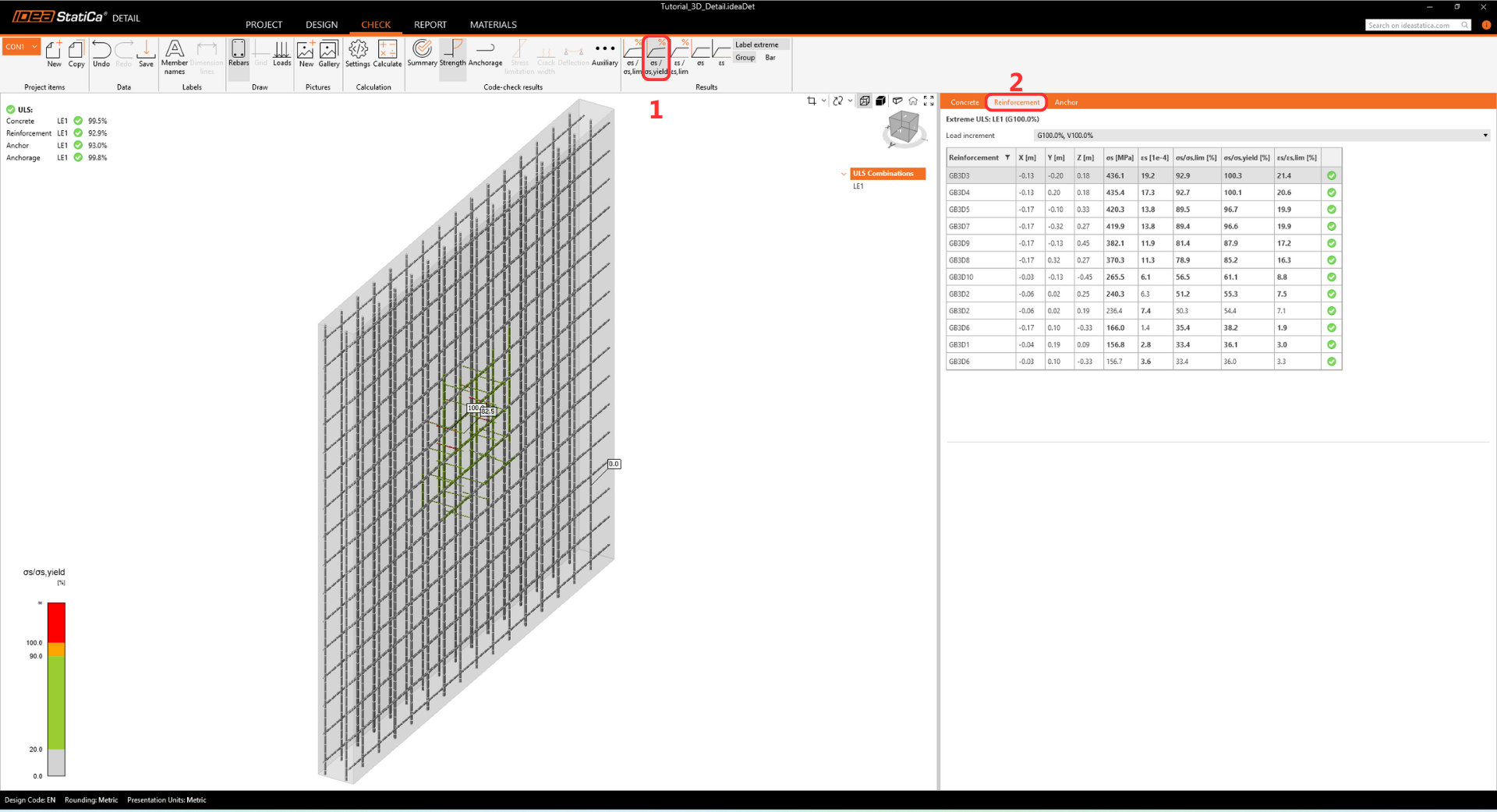 The results display the σs / σs; yield ratio (stress to yield strength), identifying the most utilized bars via a color scale. Detailed values for stress, strain, and utilization for all bar groups are listed in the Reinforcement tab.