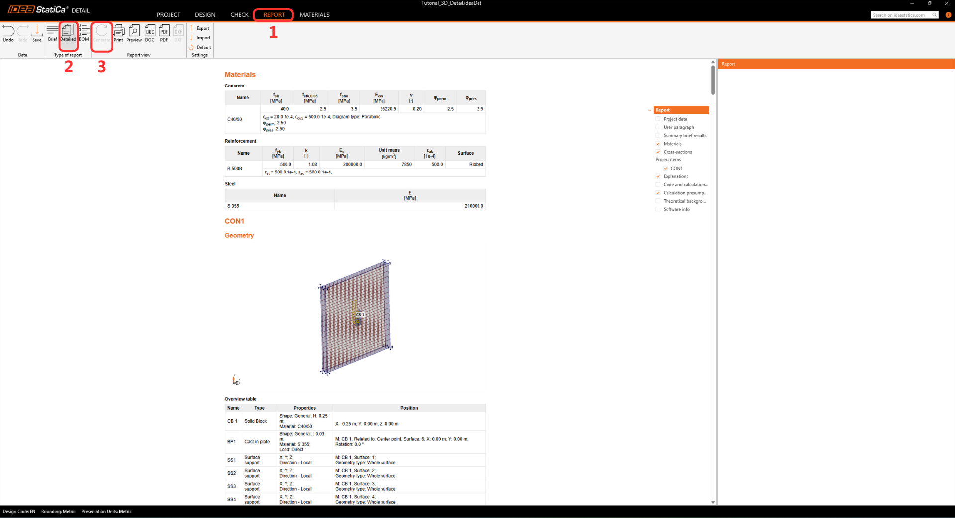 Finally, go to Report -> Detailed -> Generate. IDEA StatiCa offers a fully customizable report to print out or save in an editable format.