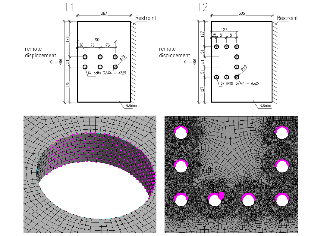 Design-oriented CBFEM model uses shell elements with rather coarse mesh. The mesh is predefined near bolt holes. Bolts are modeled as nonlinear springs which are connected to the nodes at the edges of the bolt’s holes by links. The bilinear material diagram with negligible strain-hardening is used for plates. The limit resistance of a group of bolts in bearing is determined when the plastic strain at the plate reaches 5 % (EN 1993-1-5: 2005). The bearing and hole tear-out resistances of each individual bolt are checked by formulas in appropriate code.