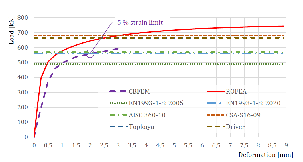 The comparison of ROFEM, CBFEM, and analytical models is shown in Fig. 5.6.3. The most conservative is the model in EN 1993-1-8: 2005 because, unlike other models, it uses the net shear plane in combination with yield strength. Yielding in the gross shear plane is observed in experiments and numerical models. In the next generation of prEN 1993-1-8:2022, the formula for block shear resistance will be changed. The stiffness of CBFEM model is lower compared to ROFEM. In the experiments, the holes were drilled with the same diameter as bolts, so there was no initial slip. The ROFEM model also disregards any slip, but in CBFEM, the shear model of bolts is approximated with the assumption of the regular bolt holes.