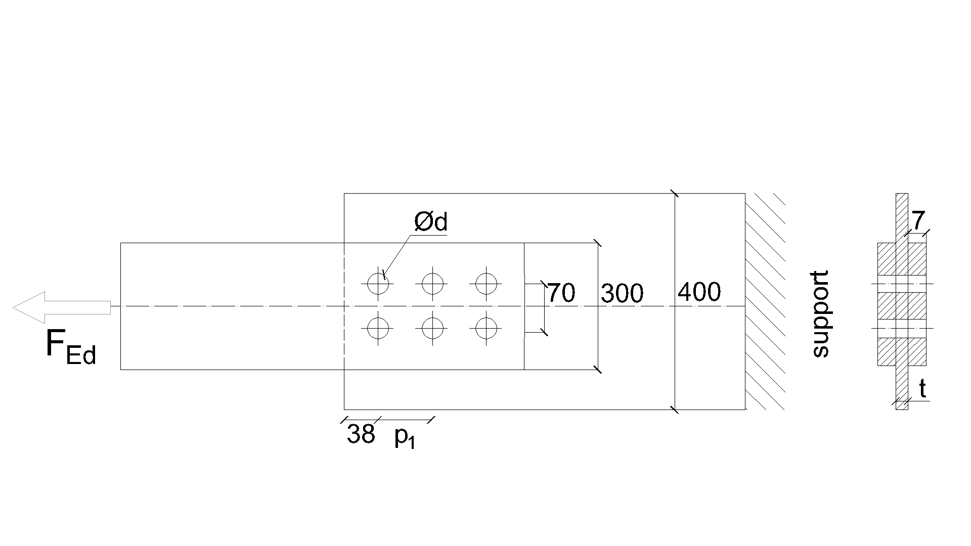 Specimen T1 was used for the study how bolt pitch, Fig. 5.6.4, and plate thickness, Fig. 5.6.6, affects the block shear resistance. The models provide expected results. Tables 5.6.1 and 5.6.2 show examples overview. Drawing 5.6.1 shows joint geometry ang dimensions. Results of verification are shown in Tables 5.6.3 and 5.6.4 and in Fig. 5.6.5. , Fig. 5.6.7.