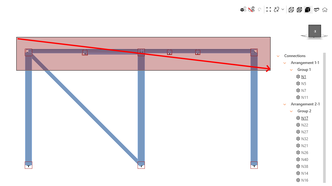 The grouping functionality automatically creates groups based on typology and/or cross-sections. The groups are then ordered from least complex to most complex based on the number of connected members. Every group is represented by the reference connection (underlined in the tree), which works as the parent connection that drives the design for the whole group. All other connections are treated as child connections.