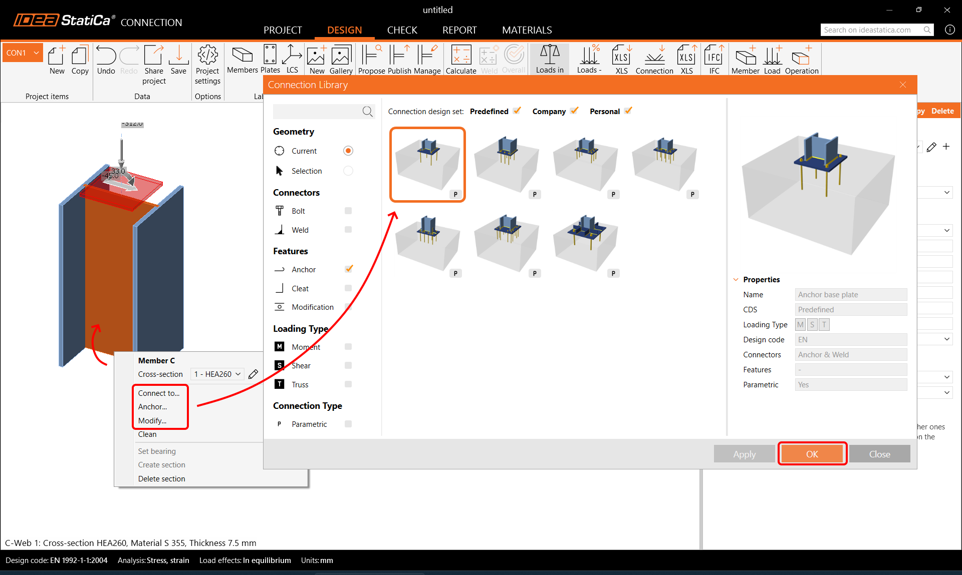 Right-click on a member and choose, e.g., the Anchor... command. Connection Library opens and offers available design templates for the selected member. Click OK to apply it