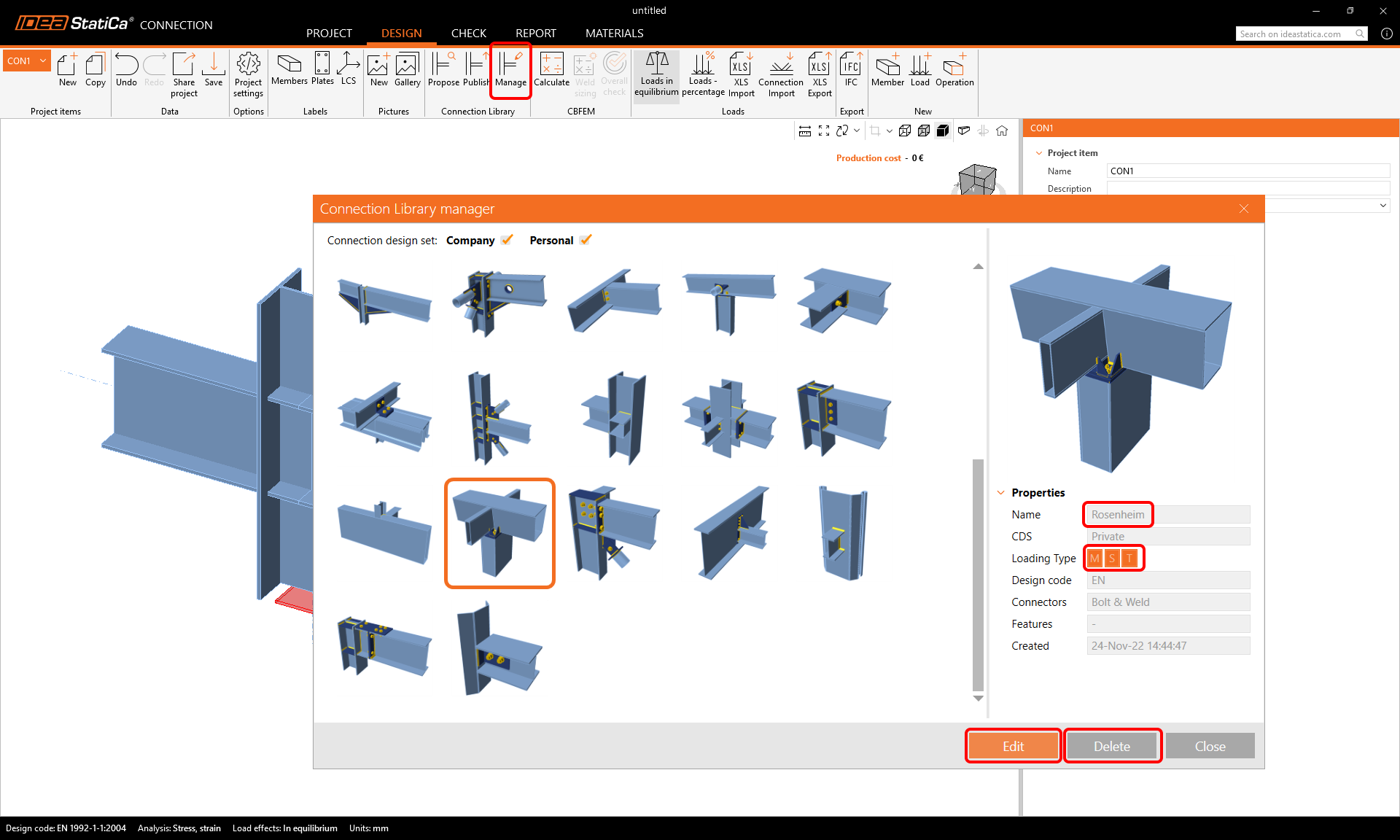 Command Manage opens the Connection Library manager. Here you can Edit and Delete all design templates in the Private set added by you and in the Company set added by both you and your colleagues. Currently, you can edit only the Name and Loading type, and you can delete templates only one by one.