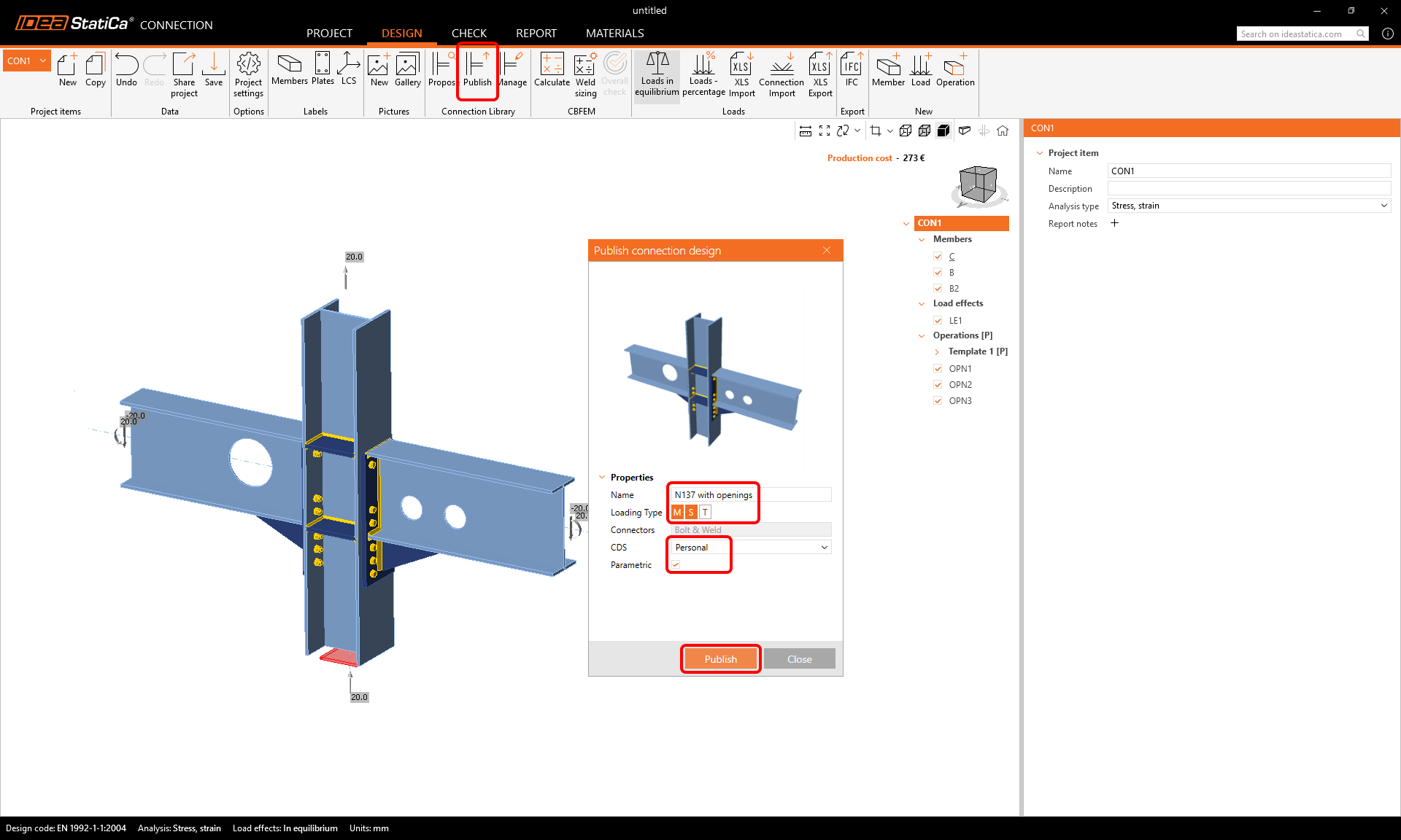 Once you finish a design from scratch or finish editing the applied template, you can save your design to the Connection Library with the Publish command. Here, you need to fill in the Name, and you can set the Loading type, choose CDS (Personal or Company design set), and tick whether this is a Parametric template. Then click Publish, and the template is sent to the cloud storage.
