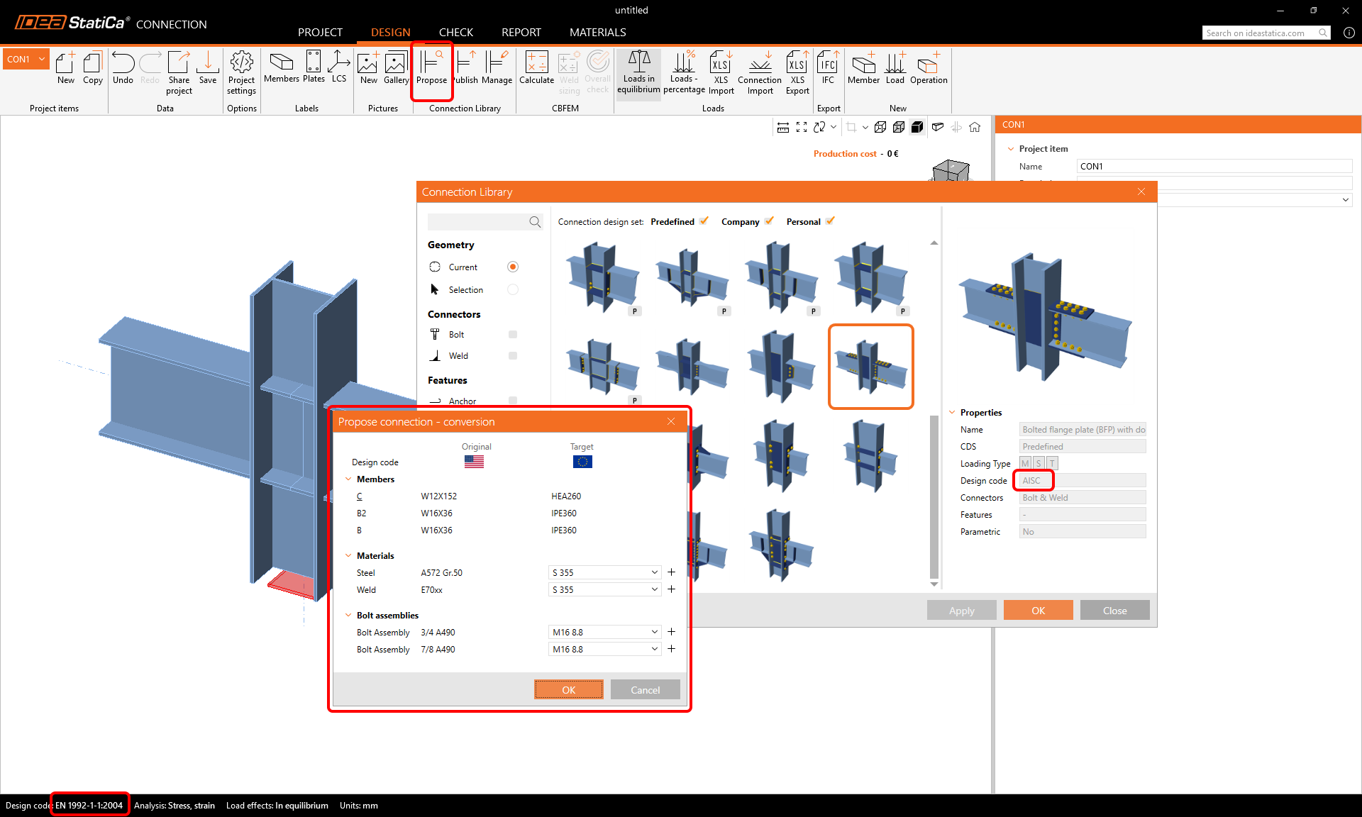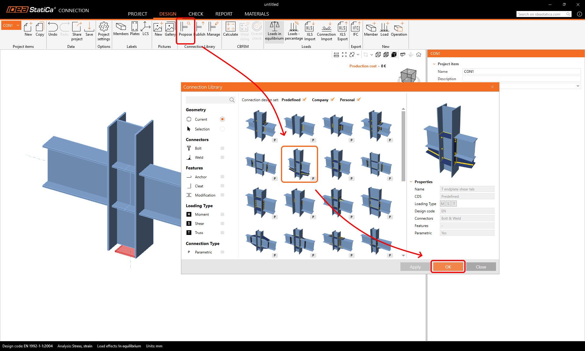 The Propose button opens the Connection Library window and automatically offers you suitable design templates for the number of members and geometry of your structural node. Select one and click OK to apply the template. A conversion tab might open at this moment, mainly for templates with different cross-section types of members. You can adjust it or just confirm the conversion by clicking OK.