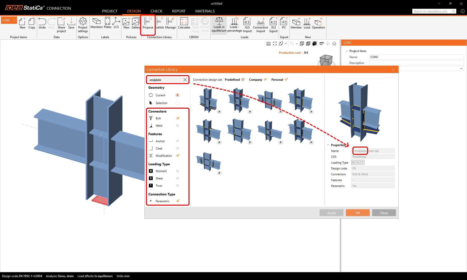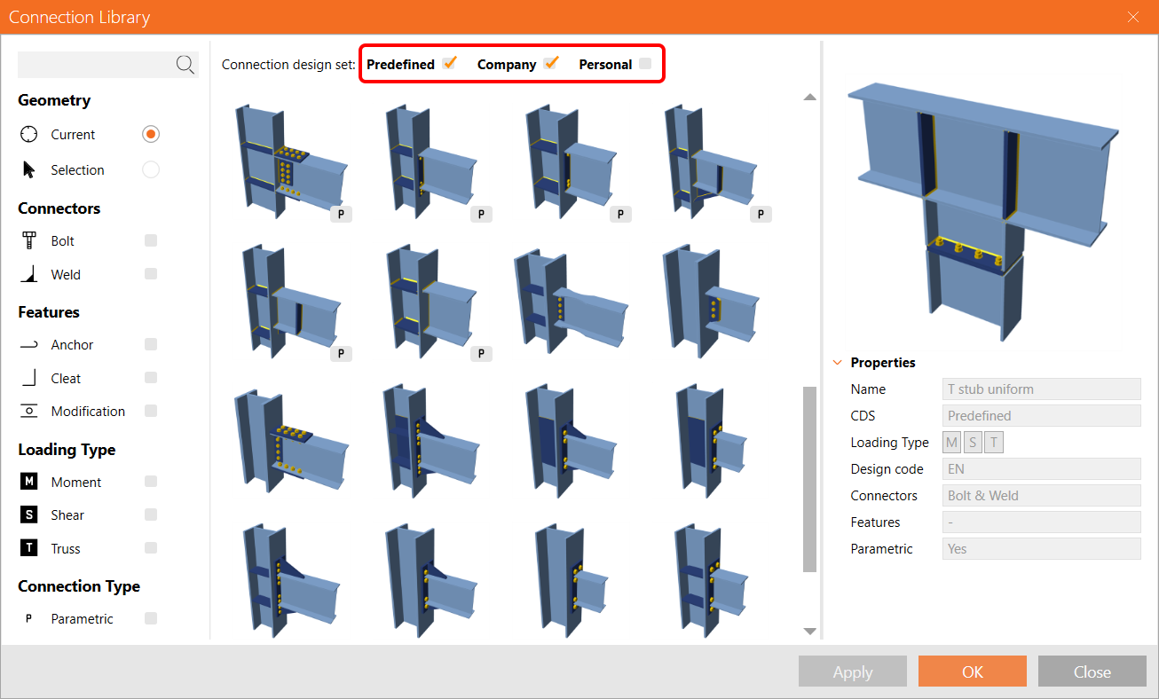 • Predefined set contains default design templates ready to use as part of the IDEA StatiCa installation. Users can not modify this set, and it is not visible in the Connection Library manager.