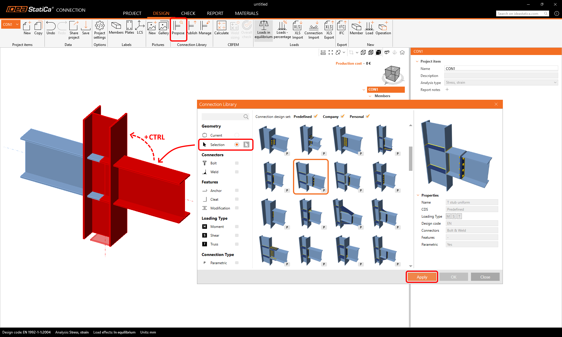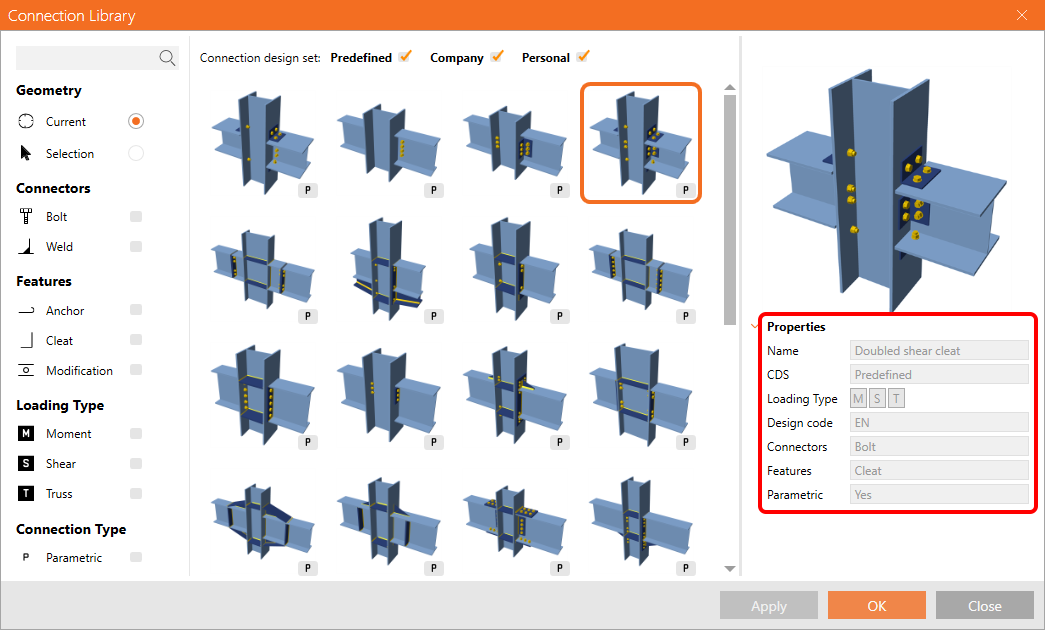 You can either browse the templates for the Current number of all the members in the node (default) or select a subset of only a few members (i.e., two or three). To do that, switch the Geometry parameter to Selection and click on the arrow icon. Then, holding the CTRL key, choose the members (selected ones turn red) and confirm the selection with Enter, Spacebar, right mouse button, or clicking on the tick icon. The Connection Library then offers you templates available for the selected geometry. Click Apply, and then Close the Connection Library.