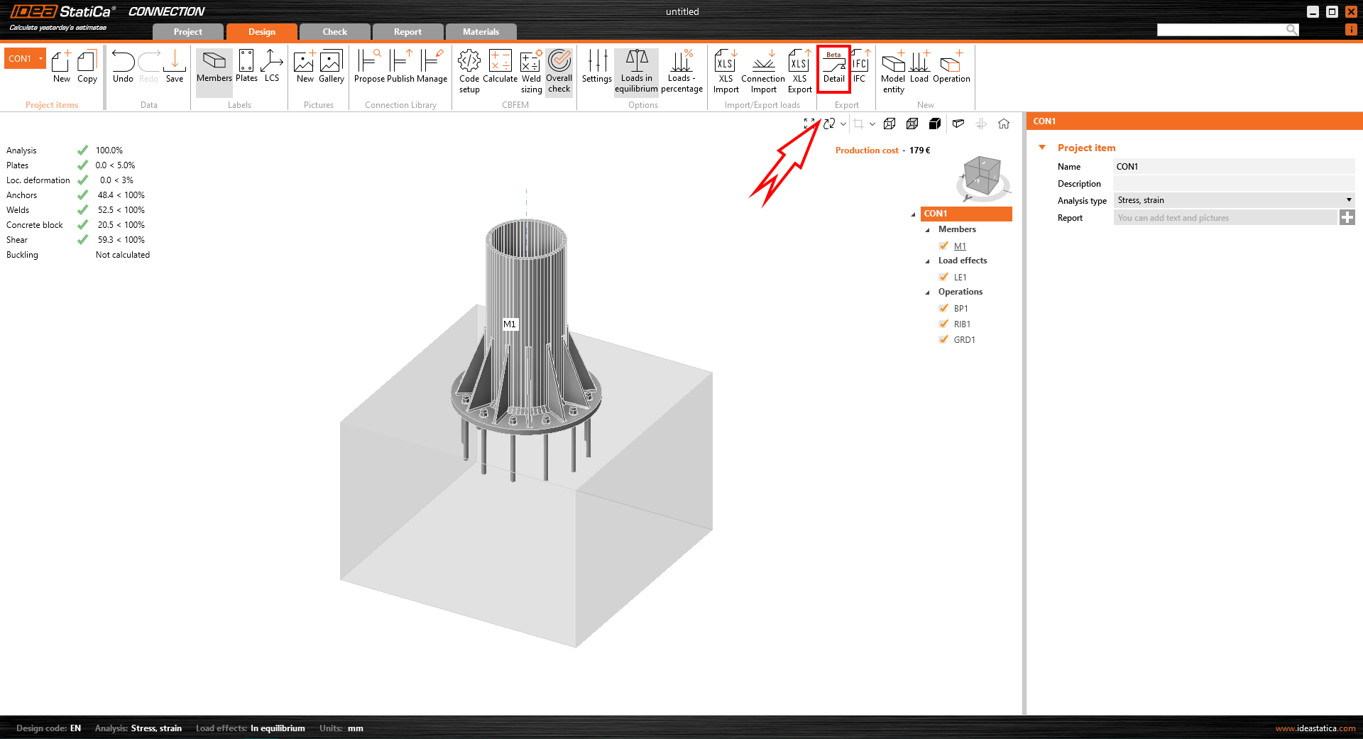 However, with the development of 3D Detail (BETA), focused on anchoring into concrete blocks and analysis of both the anchoring elements and the concrete block itself, we have a solution. Moreover, a direct link is established between our Connection and Detail applications.