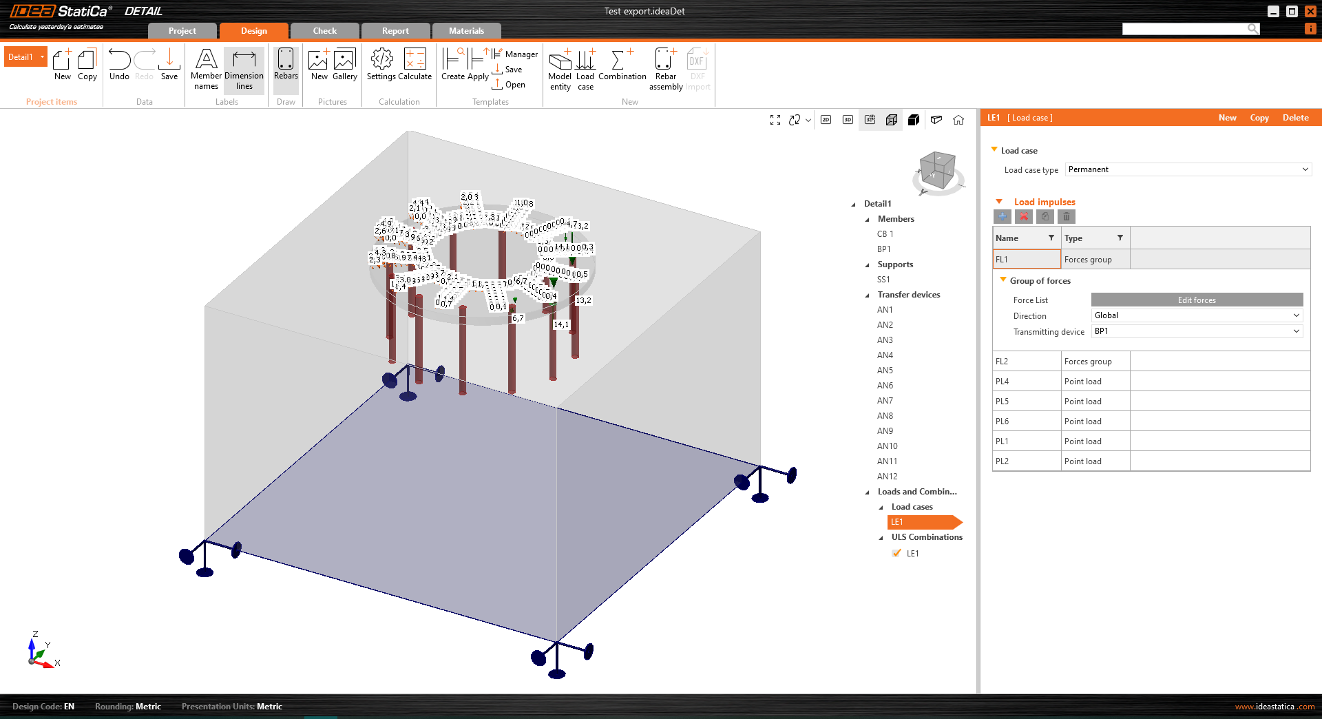 After a successful export, the project in Detail is created. The geometry of the concrete block and the base plate, the position and properties of anchors, and the load are automatically transferred to Detail. Surface support placed at the bottom surface of the concrete block is automatically created.