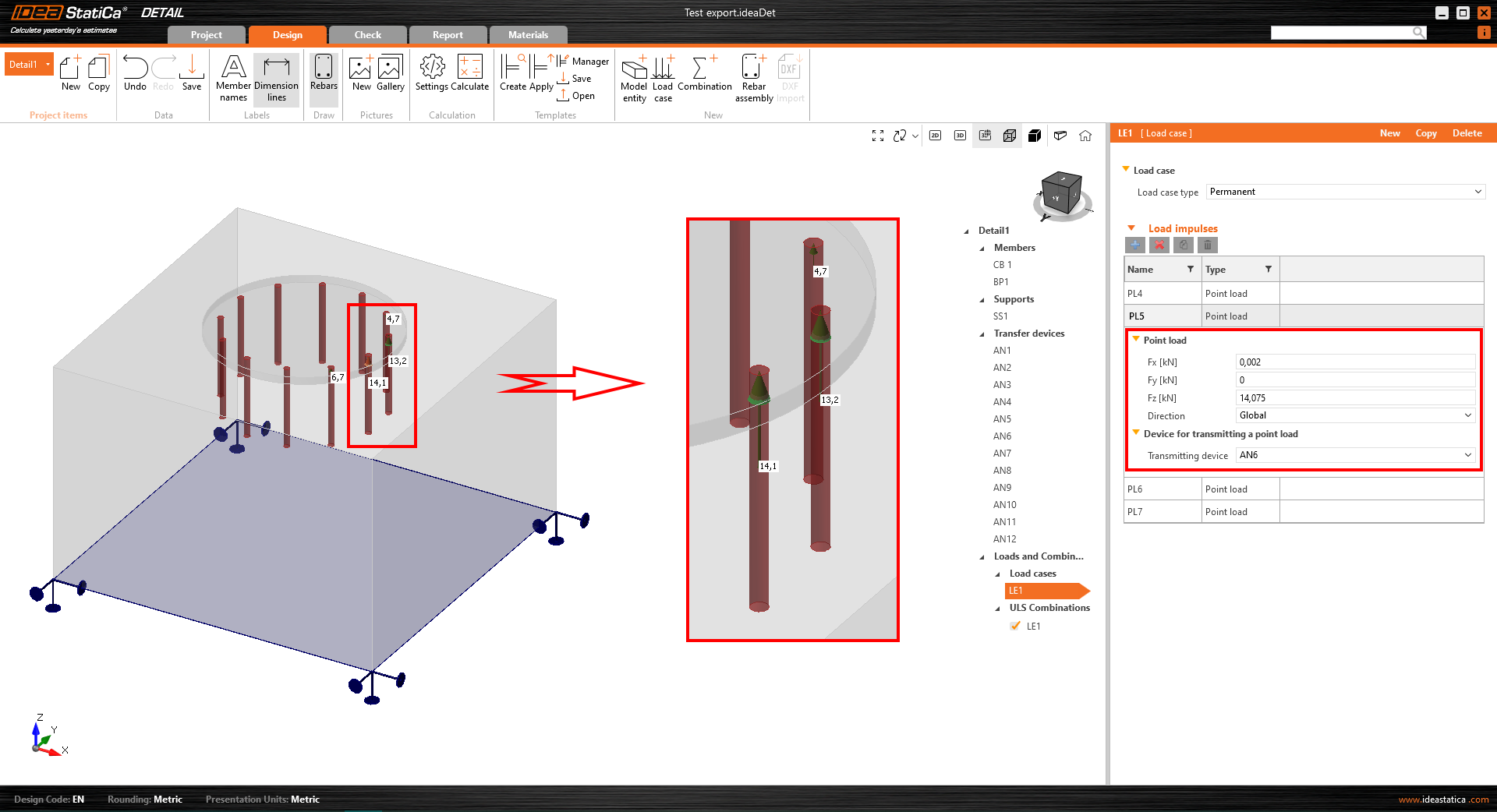 • Import is allowed just for anchoring. If there is no concrete block in the model, the export to Detail button is disabled.