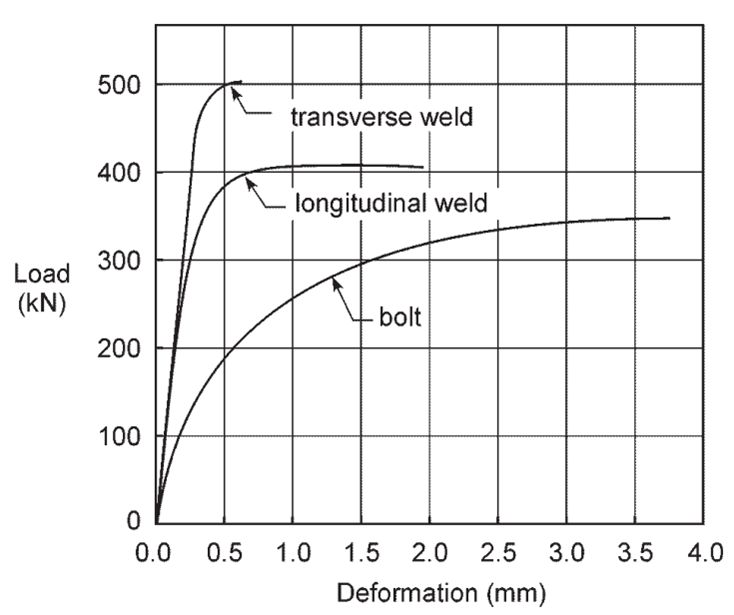 Strength checks for bolts and welds are independent in IDEA StatiCa with no special handling of when bolts and welds share load. Given the explicit modeling of the stiffness of bolts, welds, members, and connecting elements, strain compatibility is always considered in IDEA StatiCa. When bolts and welds share load, the required strength of each is based on their relative stiffness and the available strength is computed as usual. The validity of this approach can be established through comparison.