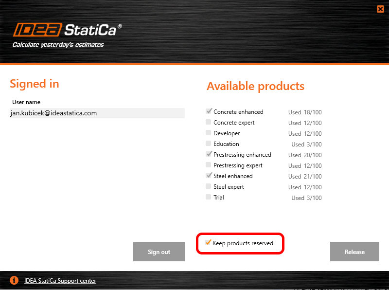 Otherwise, with the option 'Keep products reserved' turned off, the license session will be ended by closing the last active IDEA StatiCa app.