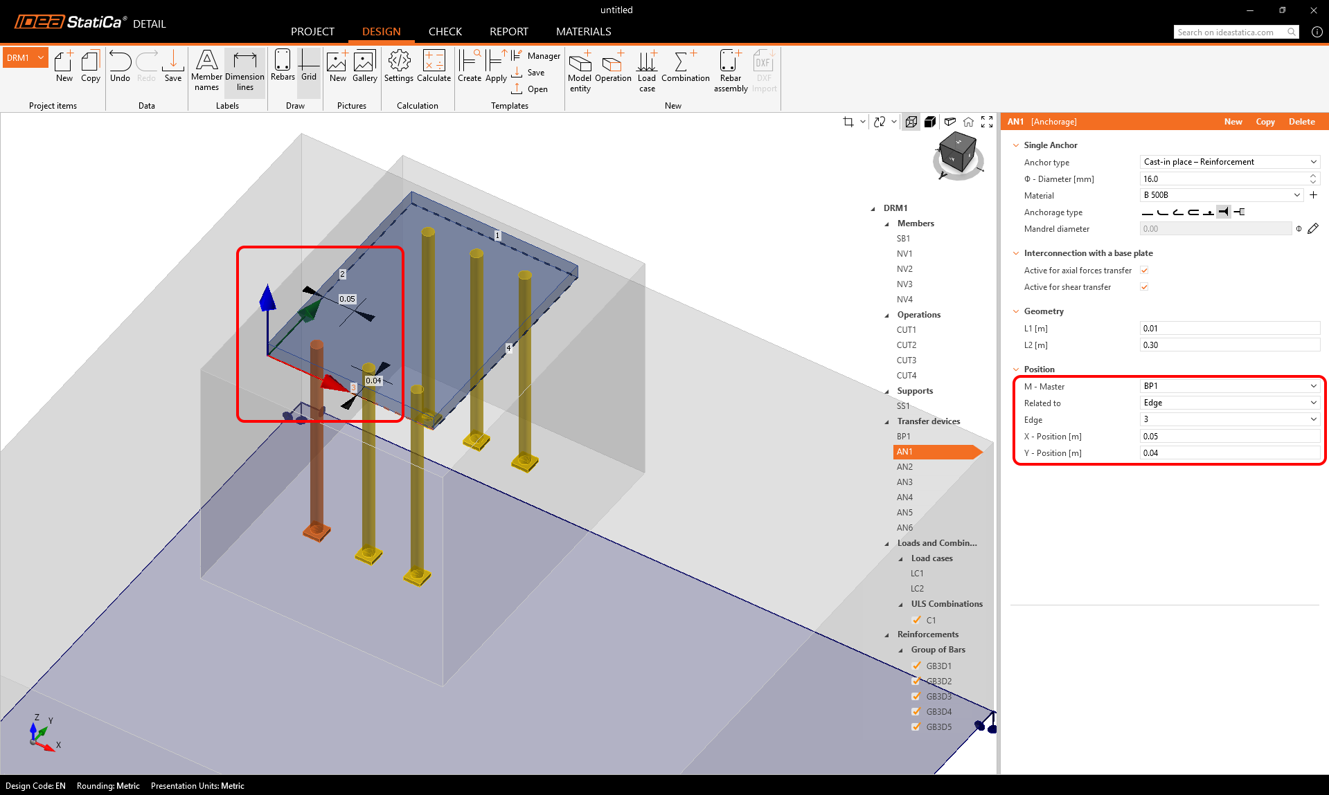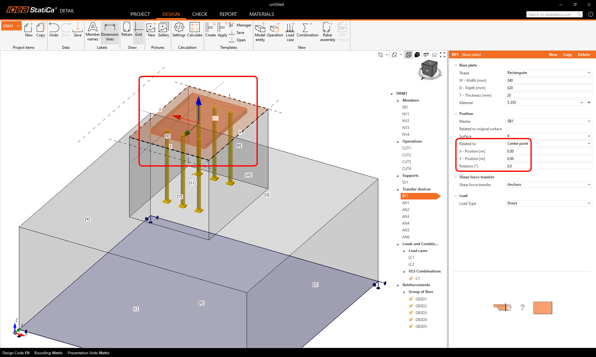 With the referencing system in Detail 3D, users can position model entities - such as base plates, anchors, supports, and loads - relative to the center point of their master entity instead of only from an edge. This means anchors can be placed directly in relation to the base plate, and all connected components automatically adjust when the geometry changes. The “Related to: Edge / Center point” option in the Property Grid makes modeling faster, more intuitive, and ensures consistent alignment without manual repositioning.