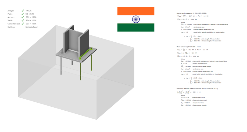 IDEA StatiCa Connection introduces anchorage checks according to the Indian Standard. This enhancement implements the new IS 1946 (Part 2):2025 and IS 1946 (Part 3):2025 provisions, enabling designers to perform anchorage verification directly within the software.