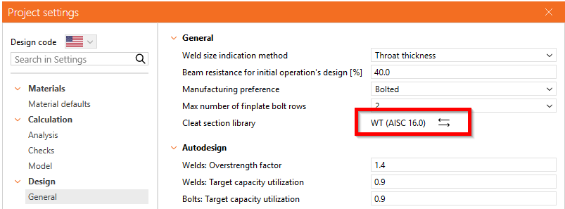 To enhance usability in connection design, the Cleat (clip angle) cross-section library is now filtered to show only applicable L-type and T-type profiles. WT sections can be chosen directly from the database and set as the default option in Project settings under Design – General: Cleat Section Library.