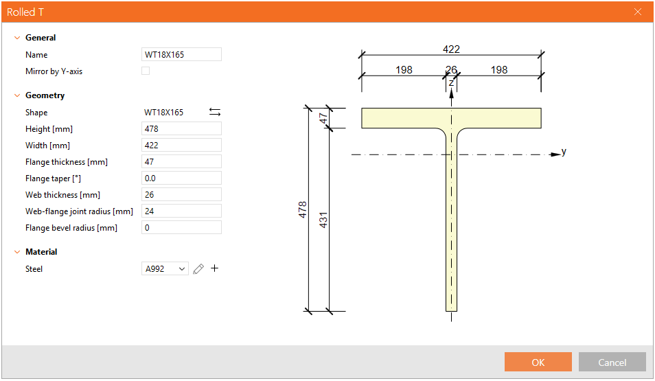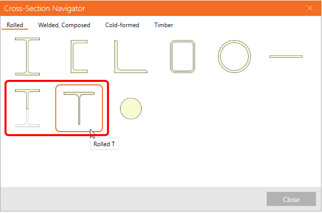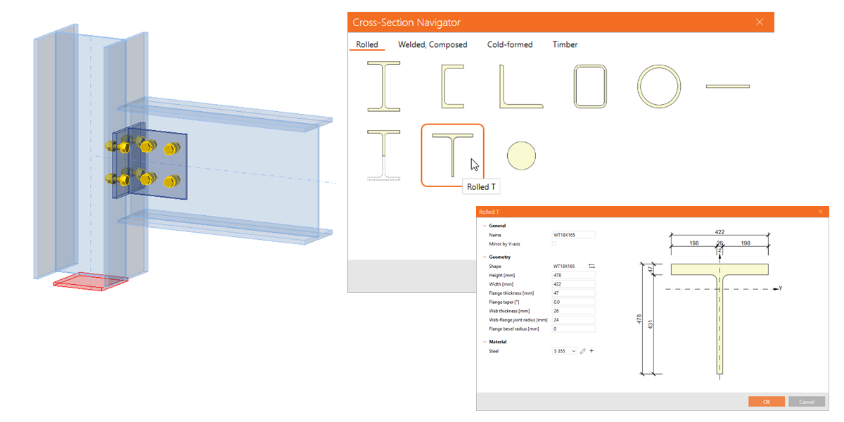 The new dialog for rolled T sections enables users to select a WT shape, adjust geometry if needed, rename the section, and assign materials, removing the need to manually derive WT profiles from W sections.