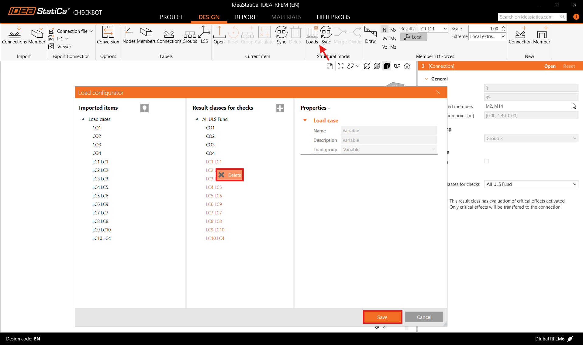 Before running the analysis, make sure to review the Result classes for checks and adjust the load cases accordingly. In the Load configurator dialog, you can see all imported load cases and load combinations on the left and the result classes used for checks in the middle. If some load cases are not relevant for your design verification, exclude them by right-clicking on the selected loads and removing them from the result classes list.