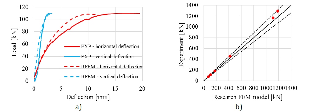An example of the comparison of RFEM and experimental test on the load-deflection behavior is shown in Fig. 6.1.3a. The comparison of resistances measured in the experiment and obtained from RFEM is shown in Fig. 6.1.3b. The resistance calculated in the numerical model is displayed on the horizontal axis. The resistance measured in the experimental study is displayed on the vertical axis. It can be seen that a good agreement exists.