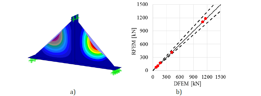 The first buckling mode of a haunch without a flange is shown in Fig. 6.1.5 a). The resistance is assessed according to formula (3.10.2) in section 3.10. The comparison of DFEM’s and RFEM’s resistances is shown in Fig. 6.1.5 b). The resistance calculated in the DFEM is displayed on the horizontal axis. The resistance calculated in RFEM is displayed on the vertical axis. It can be seen that a good agreement exists and the procedure is verified.