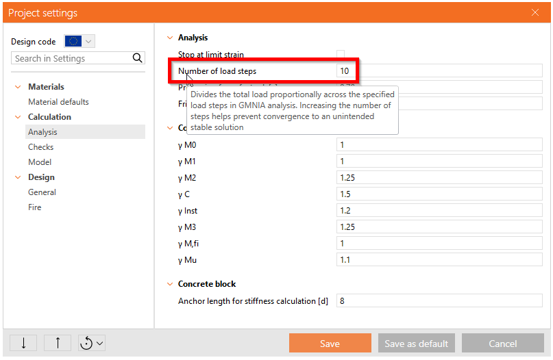 The parameter, Number of load steps for GMNIA analysis, has been added to Project settings in Member to improve stability and safety in nonlinear member calculations. The total load is divided into incremental steps (default 10), reducing the risk of the solver converging to an unintended stable branch of the load–deformation curve. This stepped approach ensures smoother load progression, more accurate equilibrium tracking, and safer prediction of ultimate resistance in geometrically and materially nonlinear analyses.