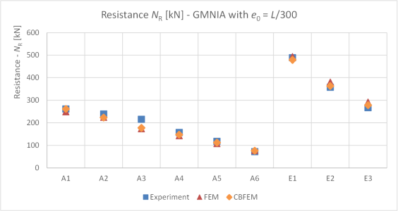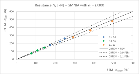 The critical load from IDEA Member (index M) is compared to a numerical solution [1] (index FEM). The ultimate resistance from IDEA Member (index M) is compared to a numerical solution [1] (index FEM) and to the experimental data as well (NR).