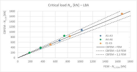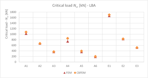 The results of LBA verification are satisfactory, critical loads from both software solutions are very similar in all but one case (A4), where the difference in results is 13 %. In all the other cases, the difference is under 5 %.