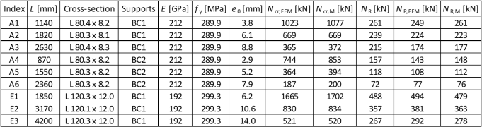 The inputs and results of the calculation are summarized in Table 1. The cross-section dimensions and material properties are presented, as well as the value of initial imperfection e0 assumed as L/300. This value is based on [2], where it is shown to best describe the behavior of angles in compression.