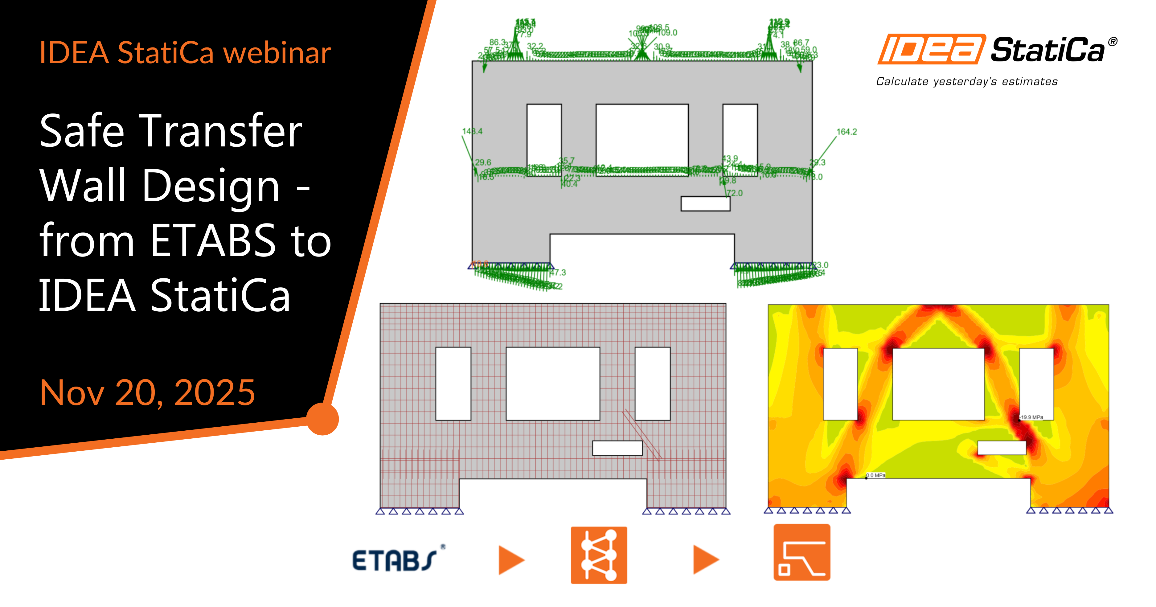 Join the webinar to see a practical example of why relying solely on global FEA software for transfer wall design can be dangerous. Instead, we’ll show how to transfer wall data to IDEA StatiCa Detail and analyse the wall using the Compatible Stress Field Method (CSFM) which is a more suitable approach. You’ll learn how to interpret imported data, define reinforcement layouts and properly read the results.